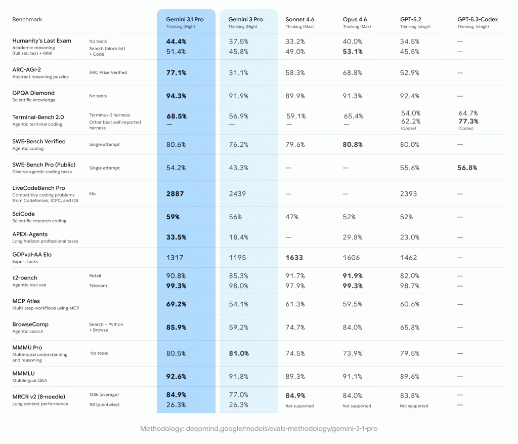 | Benchmark | Gemini 3.1 Pro | Gemini 3 Pro | Meilleur concurrent |